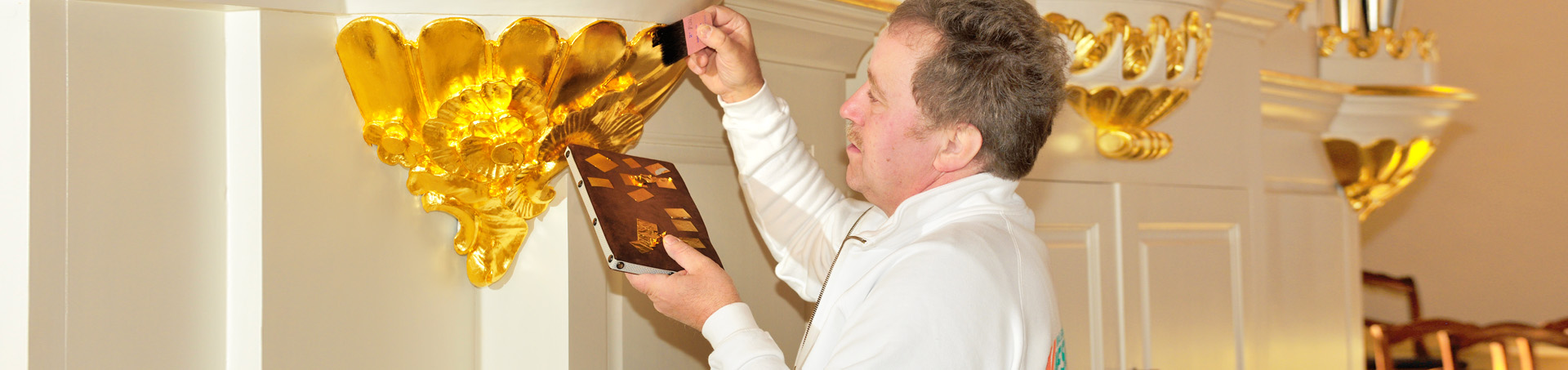 Bei der Oberflächengestaltung an historischen und modernen Bauten können wir Ihnen auch die Versilberung oder den Schutz und den Glanz mit Schlagmetall in den verschiedensten Farbtönen und Qualitäten anbieten.